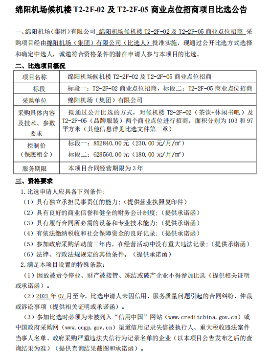 綿陽機(jī)場候機(jī)樓 T2-2F-02及T2-2F-05 商業(yè)點(diǎn)位招商項(xiàng)目比選公告